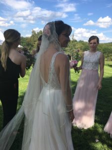 In 2018 my granddaughter Delilah Ruth Ohrstrom, who is the great-great-granddaughter of Helen Dow Hale, donned the veil for her wedding. She wore it in a shortened version for her rustic marriage in a glen on her parents’ farm in Virginia. After 100 years, the veil had sustained some rips and rough places. So Lilla trimmed the vast length of it to be only long enough to touch the ground in back. Not a church service, but in a beautiful spiritual spot in a dell, they stood in front of a flower decorated arch constructed of windfall branches. They recited their vows while the spectators sat under and china blue sky, on wooden benches set up just for this occasion. The reception under a magnificent tent went on into the night. They provided such a happy memory for all who participated.