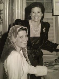 My two daughters, who are so different from each other, both wore the veil. First of them to wear it, in 1987, Lilla Youngblood Matheson. She married Christopher Ohrstrom in an antique wedding dress of the purest, cream-colored, silk, and her great grandmothers’ veil. They were married at Grace Episcopal Church in The Plains Va. It was a perfect September day, neither too hot nor too cool. They were driven in an open carriage from the church to the house ‘Heathfield’, 2 miles away. There, a country reception was held outside and all around the pool.