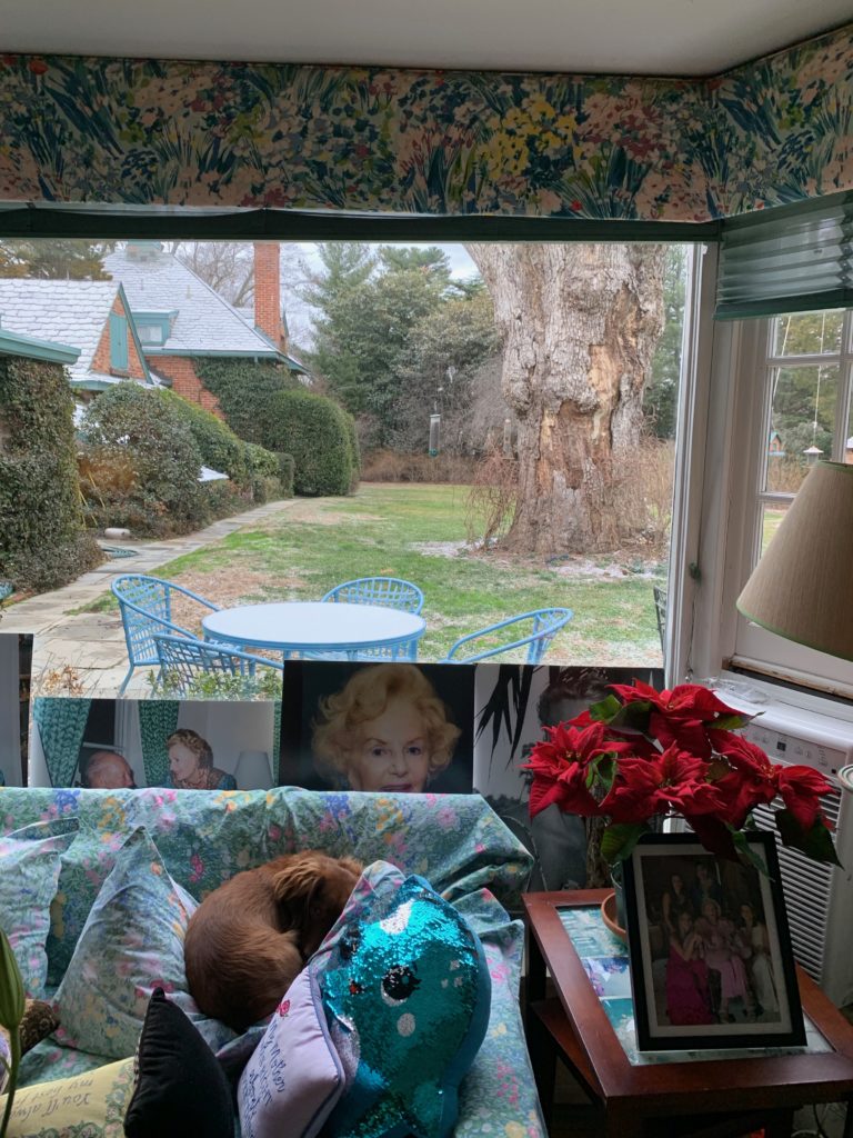 But my days are not filled with these thoughts. They are golden and full of affection from the dogs, calls, and texts from my children and grandchildren. As my fingers fly across the keyboard, my mind wanders at times to the photos and small objects here in the Garden Room, where my desktop computer sits. There are probably 100 within sight. There is a sepia picture of my grandparents when they were courting in 1917. a few really old shots are of interest to guests who have not seen them. They include a photo of my mother as a child with her grandmother. And a couple of us children when we were small and still part of our own nuclear family. Mother’s enlarged formal wedding photograph is sitting in the window with others equally “blown up” for her entertainment. One shows her dancing surrounded by black-tied men and with a formal satin gown, but kicking one stockinged leg high in the air. She loved that picture. White lilies in a vase on the blue mosaic topped coffee table contrast beautifully against the fully open blooms. The scent of the flowers evokes my mother.