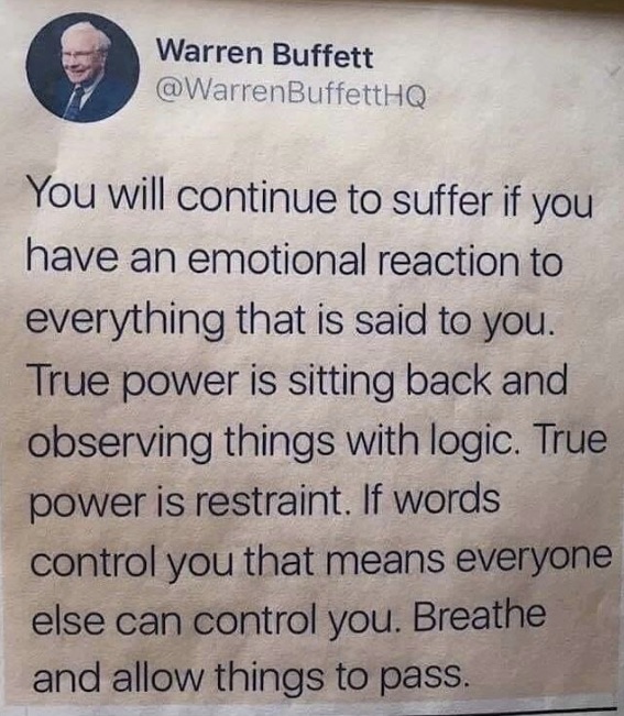 Now, everyone is scared to death to say anything for fear it might offend. This is madness. And worse, it is dangerous to our future. I love the quote attributed to Warren Buffet: “You will continue to suffer if you have an emotional reaction to everything that is said to you. True power is sitting back and observing things with logic. True power is restraint. If words control you, that means everyone else can control you. Breathe and allow things to pass.” Whether he actually said this or not, it is great advice.
